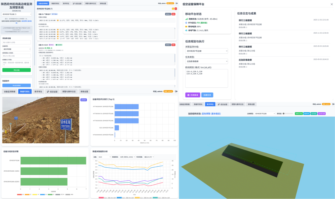 在项目现场,张琛教授团队依托自主研发的“空地一体化交通基础设施智能巡检系统”,对机场7#、8#、12#高边坡开展全覆盖飞行检测。无人机搭载多模态传感器集群,实时采集边坡表面形变、高分辨率影像及结构纹理数据,并与地面布设的应力、姿态传感器实现数据融合。通过自主开发的监测数据云平台,系统可自动完成特征识别、动态建模和风险分级预警,实现了“空中感知-地面监测-云端分析-风险提示”的全链路闭环管理。