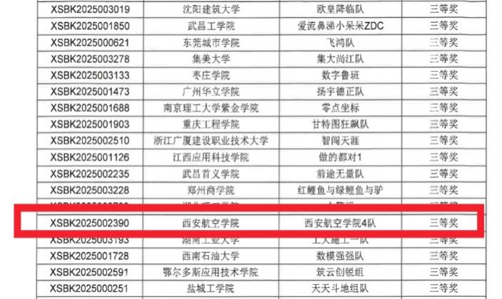 ·三等奖:西安航空学院1队(编号 XSBK2025002385,工程管理232屈江、赖营、解明昊)、
