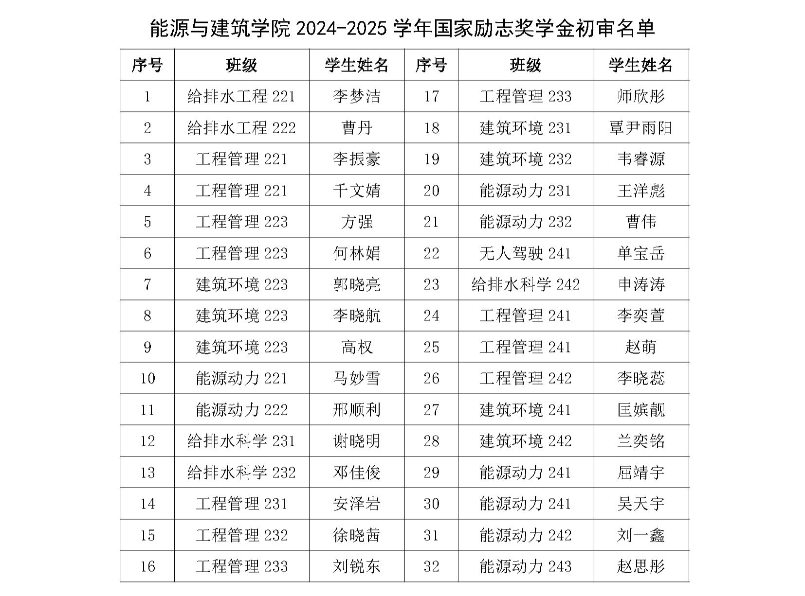 根据《西安航空学院学生资助工作实施办法》(西航院字〔2023〕58号)、《西安航空学院本专科生国家励志奖学金实施办法》(西航院字〔2023〕59号)、《关于开展2024-2025学年国家励志奖学金评审工作的通知》(西航学字〔2025〕41号)等文件要求,经能源与建筑学院学生工作办公室审核,现将评选结果进行公示,名单如下。